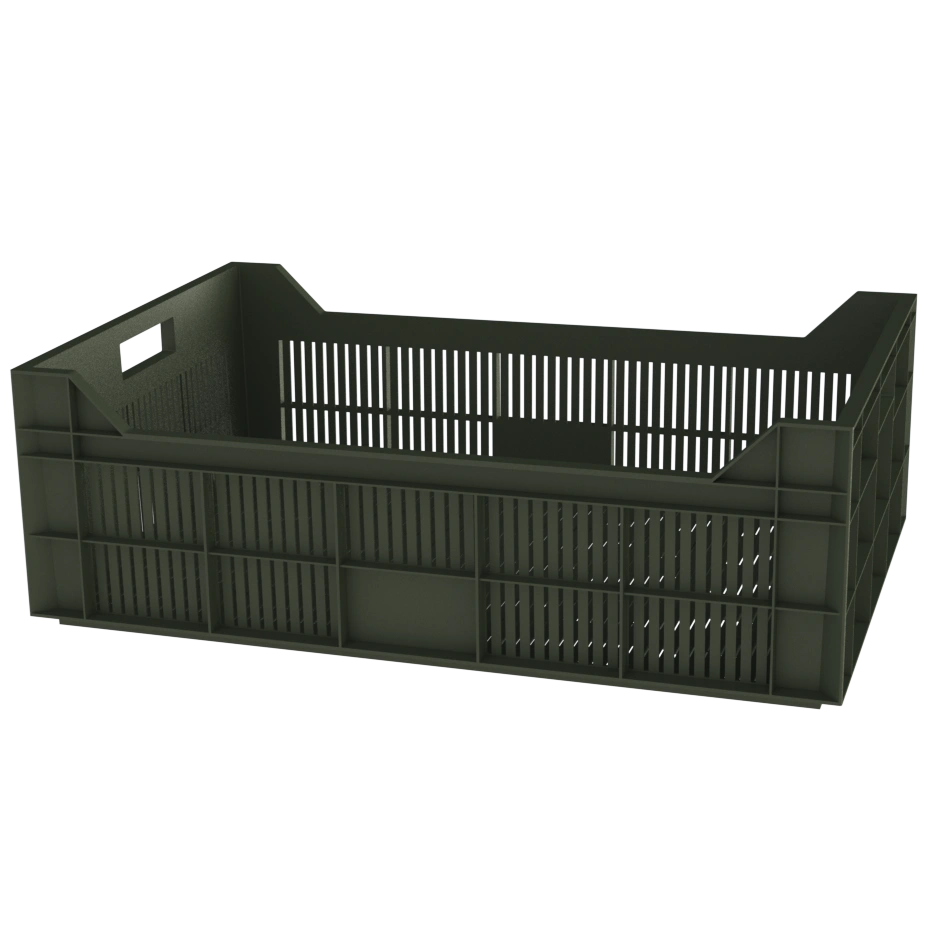 - Перфорированные стенки и дно ящика обеспечивают доступ воздуха к содержимому, что препятствует гниению продукции и способствует сохранению ее свежести в течение длительного времени
